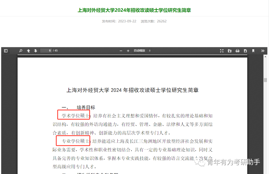 专业硕士,招生专业比较有针对性,根据研招网“专业知识库”显示,“专业学位硕士研究生”招生专业包括金融、应用统计、税务、国际商务、保险、资产评估、审计、法律、社会工作、警务、教育、体育、汉语国际教育、应用心理、翻译、新闻与传播、出版、文物与博物馆、建筑学、城市规划、电子信息、机械、材料与化工、资源与环境、能源动力、土木水利、生物与医药、交通运输、农业、兽医、风景园林、林业、临床医学、口腔医学、公共卫生、护理、药学、中药学、中医、军事、工商管理、公共管理、会计、旅游管理、图书情报、工程管理、艺术等,共计47个专业。注:具体到某一招生单位的某一具体专业是否招生,请参照招生单位当年的招生专业目录。考生调剂基本条件是初试科目与调入专业初试科目相同或相近,其中初试统考科目与调入专业统考命题科目相同。学硕的考试科目一般可以涵盖专硕的初试科目,因此调剂一般为学硕向专硕调剂。以《2024年全国硕士研究生招生工作管理规定》中的调剂要求为例:对于大部分专业来说,专业硕士较学术硕士难度略低。专业硕士公共课英语科目多考英语二,难度相对较小;学术硕士公共课英语科目考英语一,难度较大。专业硕士多数不考公共课数学科目或考数学三、经济类联考综合能力,难度相对较小;学术硕士公共课数学科目考数学一、数学二、数学三、数学(农)或招生单位自命题理学数学,难度较大。学术硕士收费标准,从2014年秋季学期起,原则上每年硕士生不超过8000元、博士生不超过10000元。全日制专业硕士收费标准,按不高于本校现行普通专业学术型自筹经费研究生收费标准确定(没有普通专业学术型自筹经费研究生的学校,应参照当地其他院校同类专业的有关收费标准确定)。具体表现为,专业硕士学制一般为2-3年,学术硕士学制一般为3年。具体情况依各招生单位当年政策为准。学术硕士,实行单导师制。在基本职能方面,研究生导师对学生进行研究生课程教学、课题研究指导与学位论文指导。在导学内容方面,研究生导师对其研究生在读研期间的全过程进行指导。研究生论文完成后,指导教师要对研究生作出客观、全面、准确的评价,并负责向导师组申请审查同意,提交院学位评定委员会,申请组织答辩。专业硕士,实行双导师制。根据教育部相关文件精神,各专业学位研究生培养单位要建立健全校内外双导师制,以校内导师指导为主,校外导师应参与实践过程、项目研究、课程与论文等多个环节的指导工作。在培养过程中校内导师以教授理论知识、学术指导为主,而校外导师则以培养技能、指导实践为主。学术硕士的学位论文,强调科学理论研究与原创学术创新,一般为学术性论文。专业硕士的论文强化应用导向,形式可多种多样。鼓励采用调研报告、规划设计、产品开发、案例分析、项目管理、文学艺术作品等多种形式。学术硕士可以通过自己的导师直接读博,不用参加全国统考,也就是我们所说的直博或者硕博连读。专业硕士一般不能硕博连读或直博,硕士毕业后若进行考博,请咨询招生单位了解相关政策。